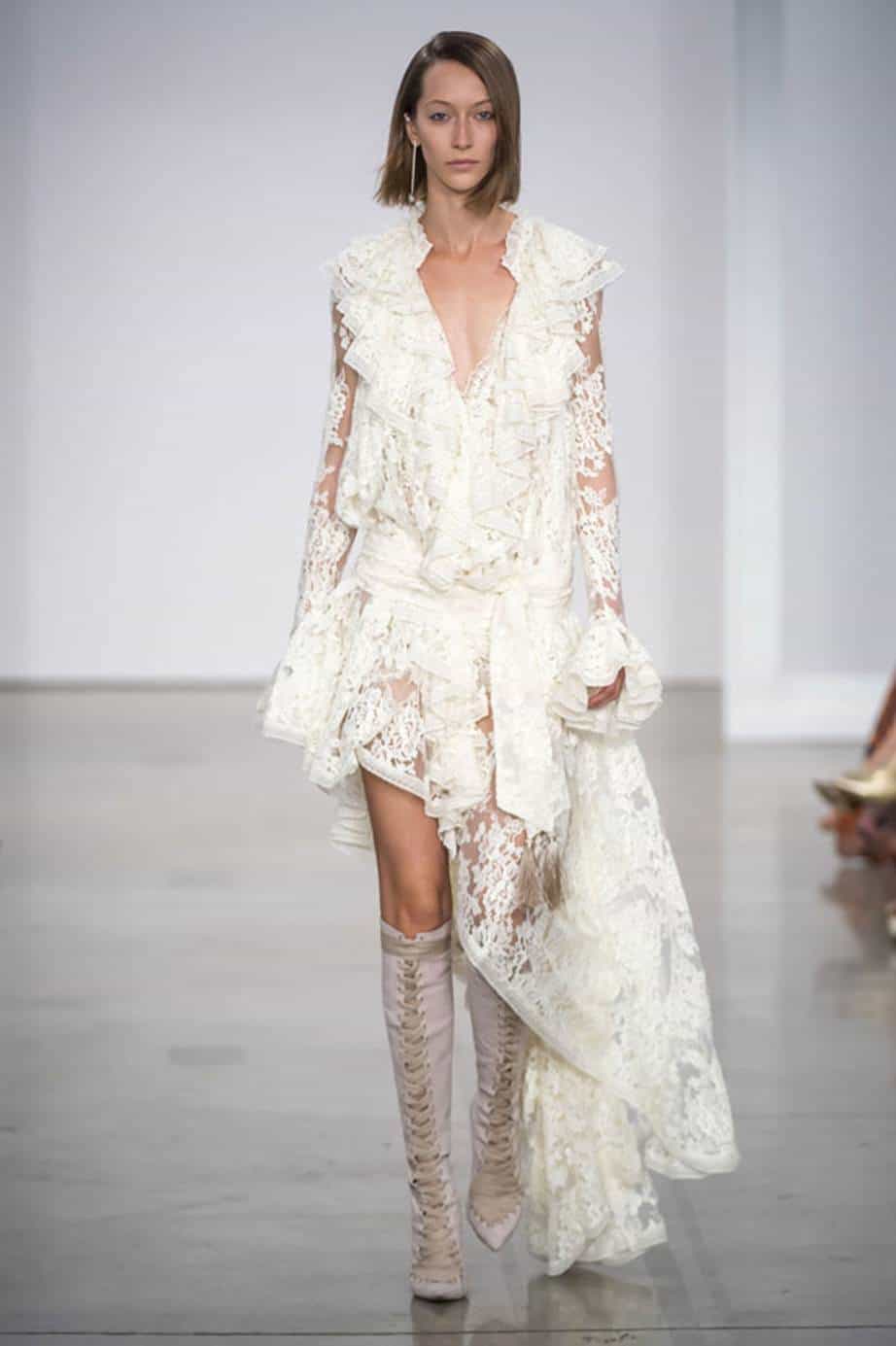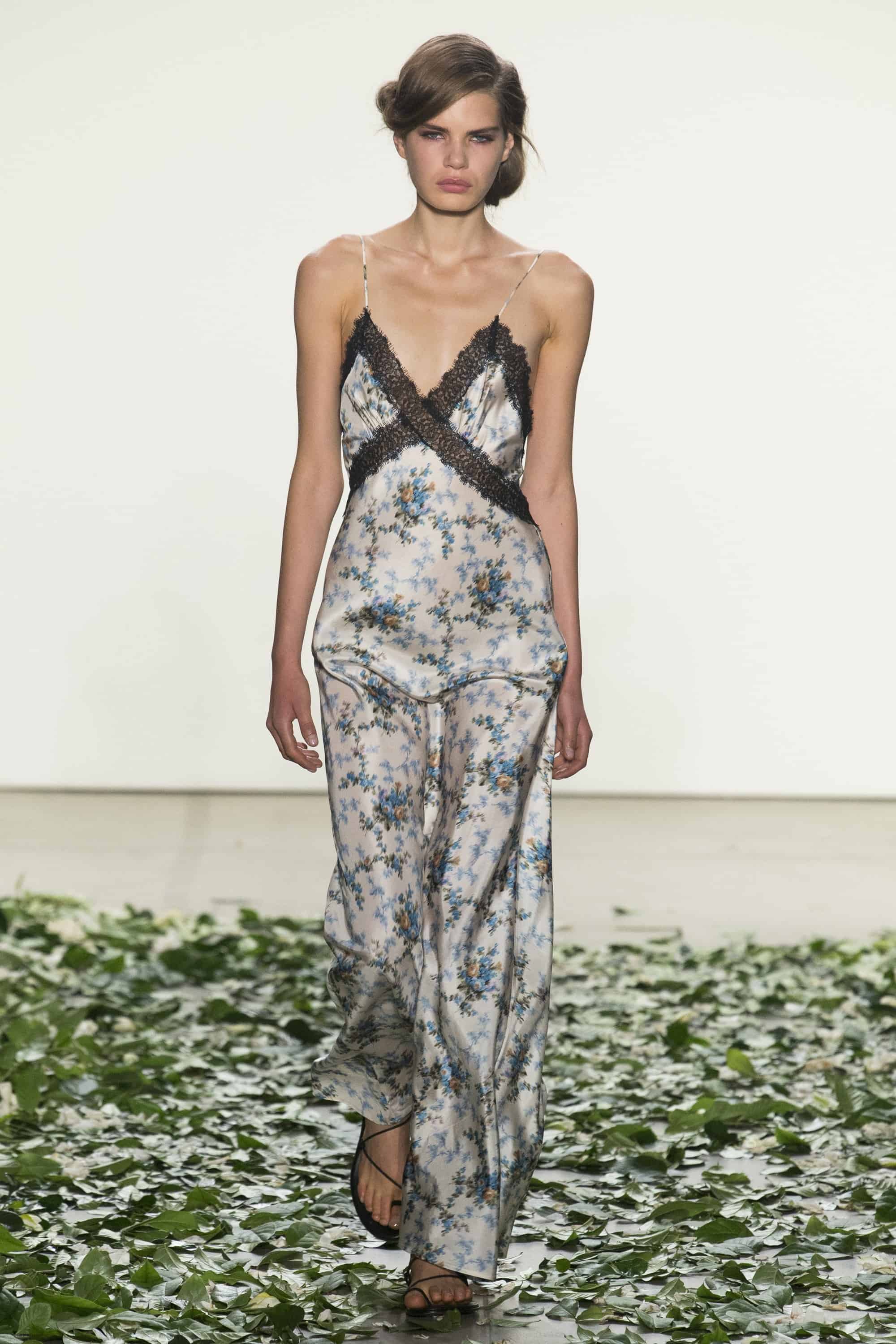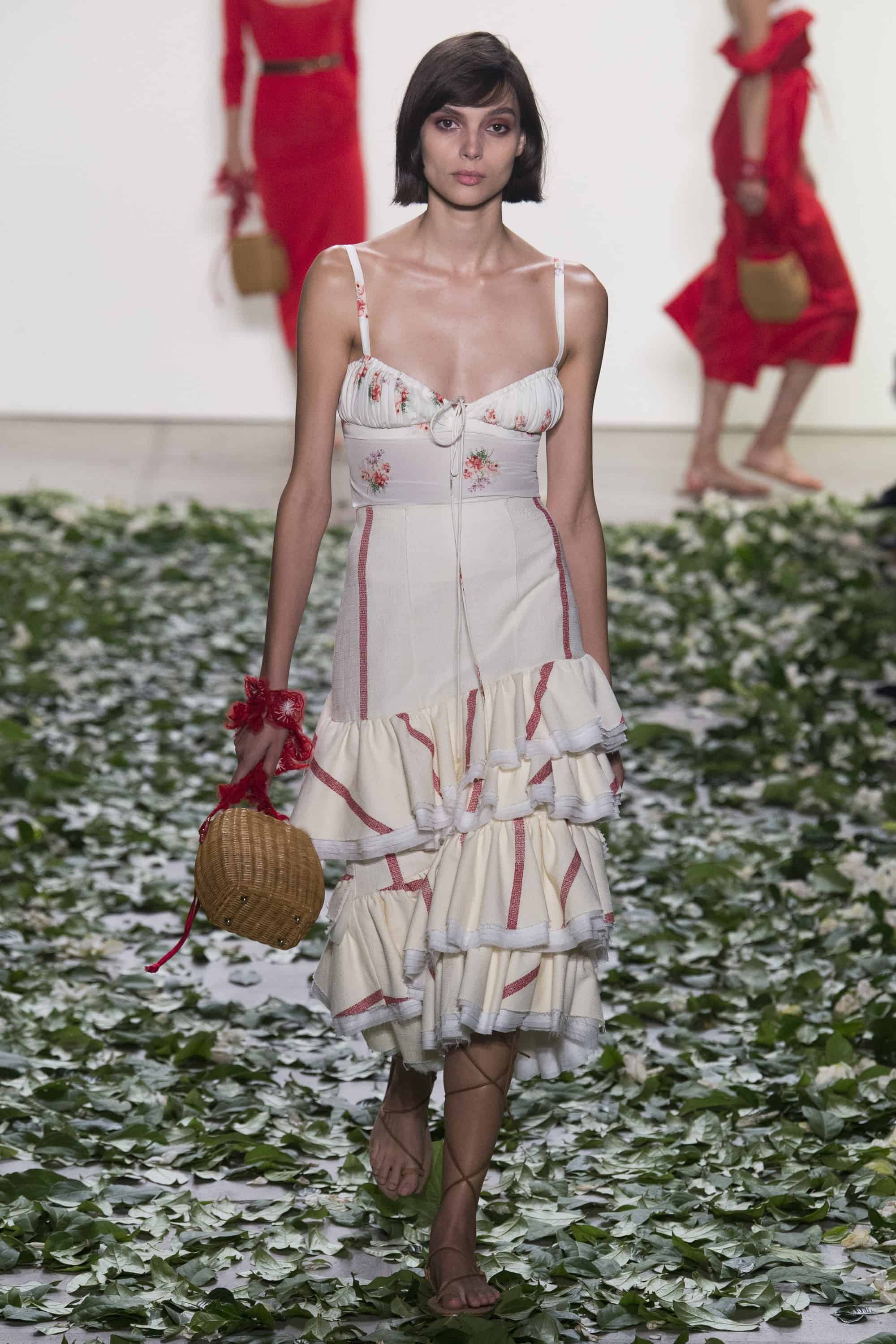 This beachy collection had a play with floral prints, breezy dresses, and sexy-sweet ruffles. The Newport Beach designers took it back to the roots and embraced raw yet romantic designs. Minimal yet intricate, the collection demonstrated the designers close attention to lace, embroidery and detail. Cherry tones and flat gladiator sandals accompanied many looks. Easy off-the-shoulder vibes were a signature look for this collection and give off a sensual ‘just slept in’ vibes.