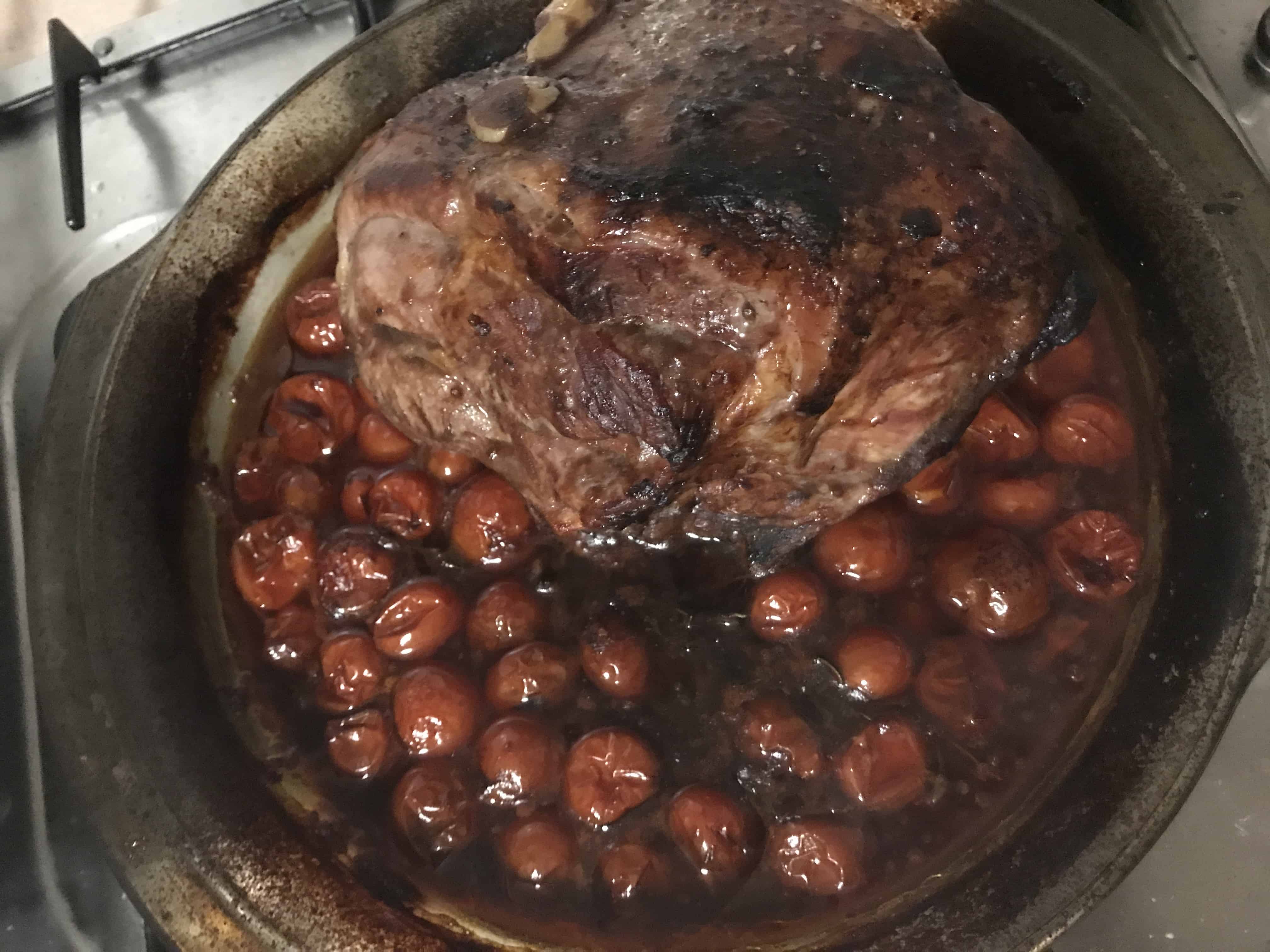 - Place the port, tomatoes,caramelised onion, garlic and rosemary in a deep-sided large roasting pan and mix to combine. Place the lamb on top of the tomato mixture, drizzle with the oil and sprinkle with salt and pepper. Cover tightly with aluminium foil and cook for 2½ hours